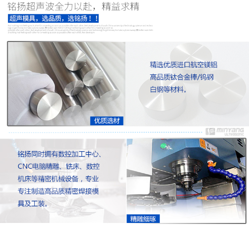 正规超声波模具生产商进料都有一套严格地检验程序,加工尺寸都是经过计算机软件模拟和校验后加工出来的。品质才有保障,这些工序一般作坊是无法做到的,如不经过合理地设计,做出的模具,在焊接小工件时,反应问题还不明显,当大功率时就会出现各种弊端。严重时直接损坏功率组件。铭扬公司所出厂的每套超声波模具都经过严格选材和有限元分析3D设计制作而成,充分保证了产品焊接部位超声波焊头振幅的一致性,达到产品焊接均匀稳定的效果。